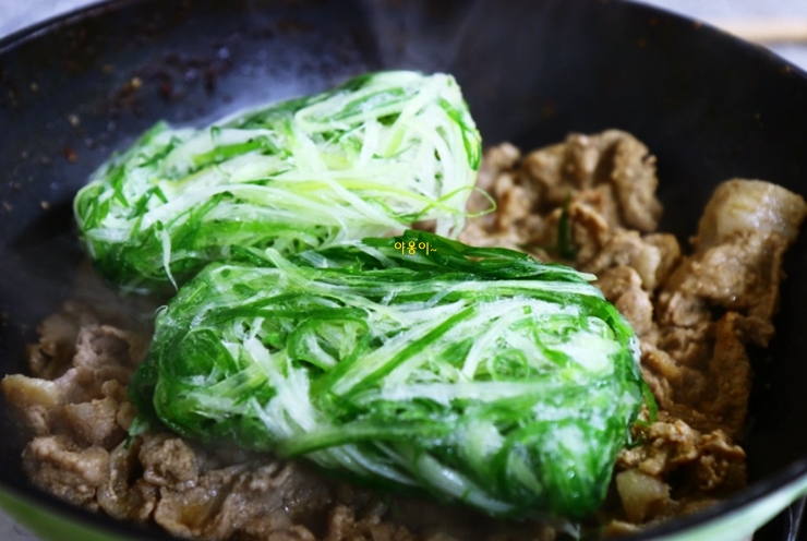 연남동 맛집 기사시당 돼지불백 조리법 나는 국물이 많은 것보다 없는걸 선호한다. 그래야 더욱 짭쪼름한 맛을 낼 수 있기때문이다. 어느정도 조리가 되면 같이 포장되어 있는 파채를 넣으면 된다.