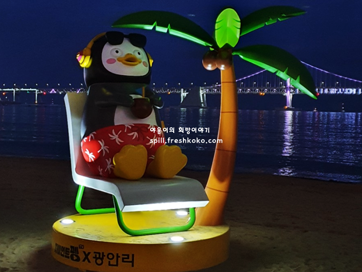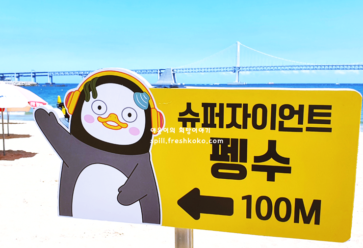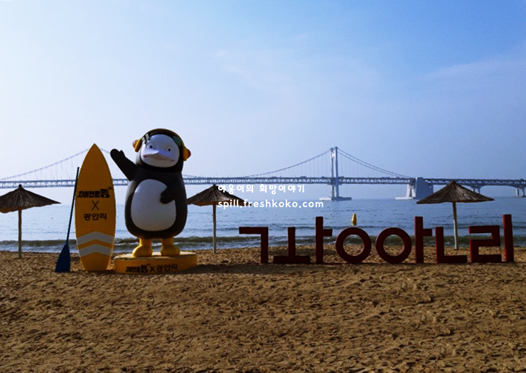 넓은 해변, 각종 편의시설, 멋진 경치 등 어는 것 하나 빠지지 않는 광안리해수욕장 지금은 새로운 친구가 우리를 반기고 있습니다. 유튜브 스타 펭수가 펭하! 하고 반겨주는 부산 여행 코스 추천 장소입니다.