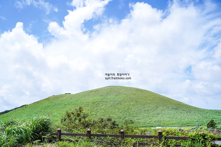 오름의 경사는 완만하며, 초록빛의 드넓은 초원이 펼쳐져 있어 걷기 좋습니다. 특히 봄과 여름에는 푸른 잔디가 아름다운 풍경을 연출하는 제주 애월 가볼만한곳 입니다.