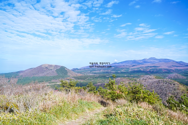 정상에 오르면 제주 동부의 아름다운 풍경이 한눈에 펼쳐집니다. 멀리 바다와 다른 오름들이 보이며, 맑은 날에는 한라산까지도 보일 수 있습니다.